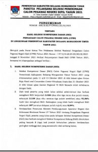 Infototabuan, Boltim – Panitia Seleksi (Pansel) Penerimaan Calon Pegawai Negeri Sipil (CPNS) mengumumkan hasil Seleksi Kompetensi Dasar (SKD) di instansi Pemerintah Kabupaten (Pemkab) Bolaang Mongondow Timur (Boltim).