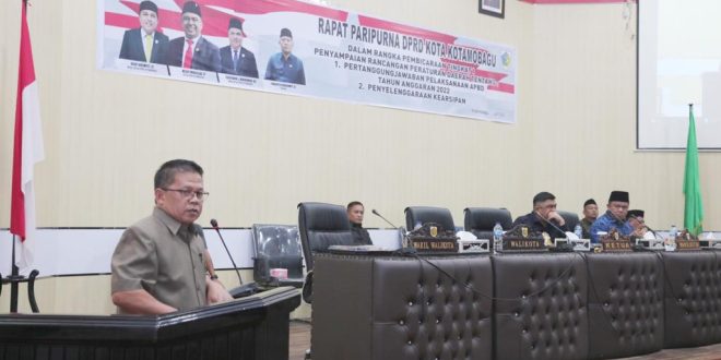 Infototabuan, Kotamobagu — Wakil Wali Kota Kotamobagu, Nayodo Koerniawan, S.H., menyampaikan Rancangan Peraturan Daerah (Ranperda) tentang Pertanggungjawaban pelaksanaan APBD Kota Kotamobagu Tahun Anggaran 2022, pada pelaksanaan Rapat Paripurna DPRD Kota Kotamobagu, Senin (10/7).