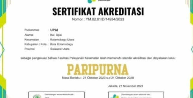 Infototabuan, Kotamobagu – Puskesmas Kelurahan Upai berhasil meraih akreditasi paripurna. Prestasi ini menandai komitmen dan dedikasi dalam menyediakan layanan kesehatan terbaik bagi masyarakat, Rabu (6/12).