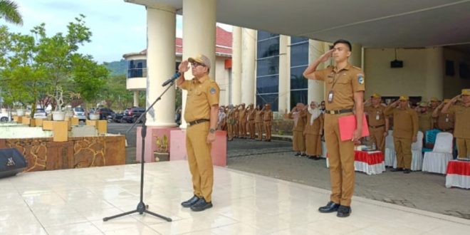Info Totabuan – Penjabat Bupati Bolaang Mongondow Utara Darwin Muksin, S.Sos., M.M bertindak selaku pembina apel kerja perdana pasca hari libur dan cuti bersama Hari Raya Natal Tahun 2024 dan Tahun Baru 2025. Di halaman Kantor Bupati Bolmut, Senin (06/06/2025).