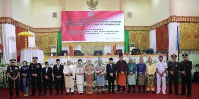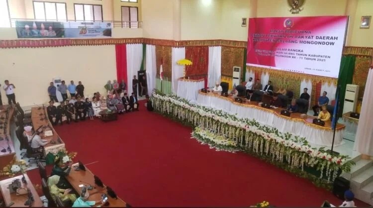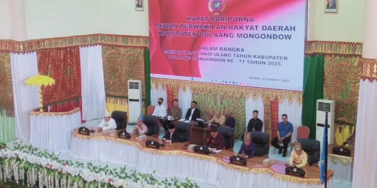 Bolmong, Infototabuan.com – Dewan Perwakilan Rakyat Daerah (DPRD) Kabupaten Bolaang Mongondow (Bolmong) menggelar rapat paripurna istimewa dalam rangka memperingati Hari Ulang Tahun (HUT) ke-71 Kabupaten Bolmong, Senin (24/3/2025). Kegiatan ini berlangsung khidmat di ruang paripurna Kantor DPRD Bolmong.