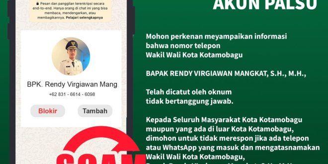 Kotamobagu – Pemerintah Kota Kotamobagu mengeluarkan peringatan keras kepada seluruh masyarakat terkait maraknya penipuan yang mengatasnamakan pejabat daerah. Kali ini, nomor telepon yang dikaitkan dengan Wakil Wali Kota Kotamobagu, Rendy Virgiawan Mangkat, S.H., M.H., dilaporkan telah dicatut oleh oknum tidak bertanggung jawab untuk menjalankan aksi penipuan.